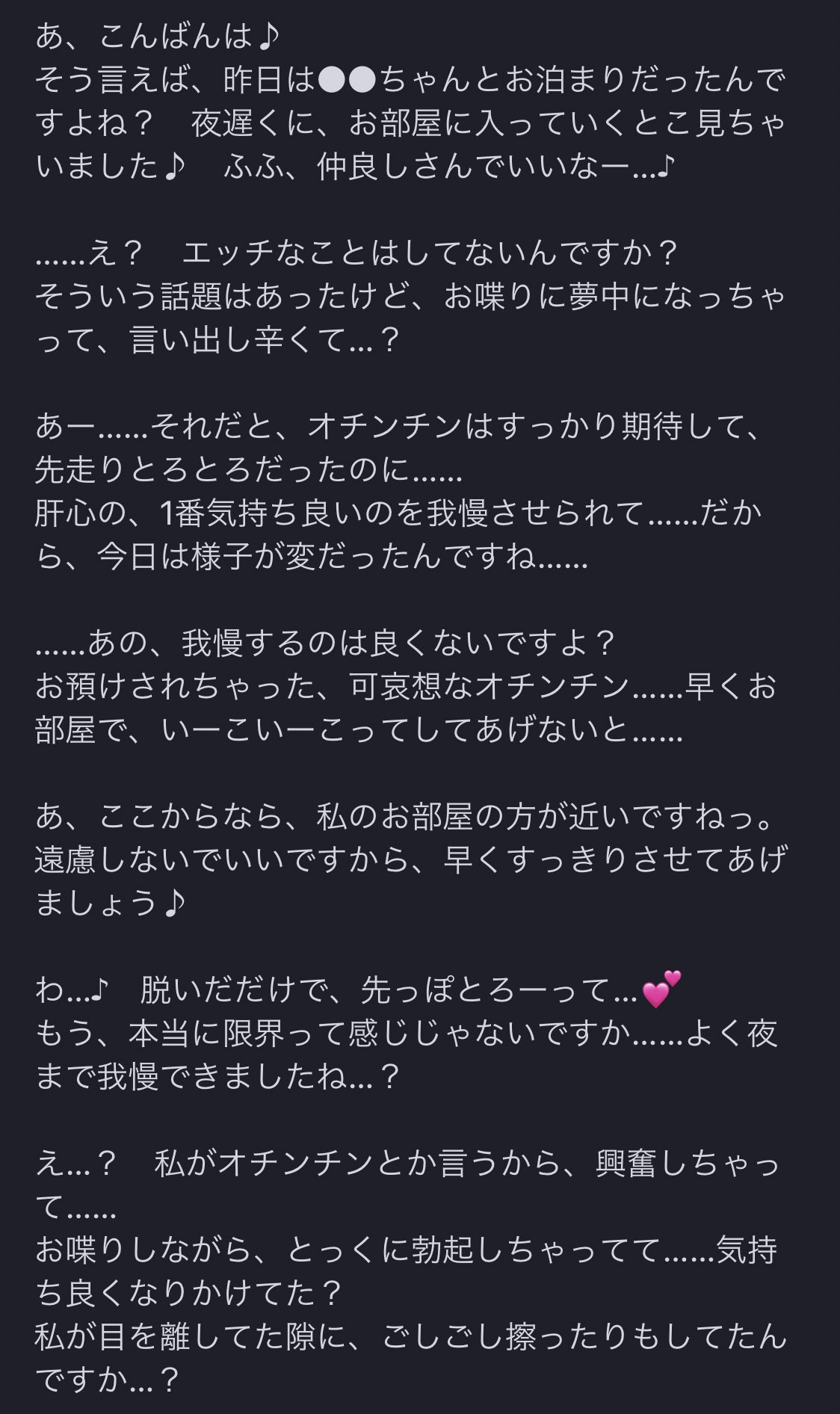 “偽物おまんこのヒダに油断してるところ擦られて、クリティカルヒットで一気に気持ち良くなっちゃったオチンチンが、パパに「早く出せっ💕💕」って暴れちゃうの可愛いですよねっ♪ 我慢できずに漏れちゃうかも、ってぎゅって力入れて耐えて、我慢汁が「……とぴゅ💕」でギリギリ収まるくらいの!”